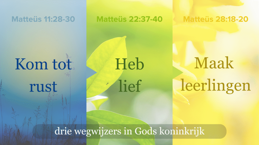 Voor mij was het een mooie ontdekking dat er in het Matteüs-evangelie op drie plekken door Jezus iets belangrijks wordt gezegd. Ik ben die drie uitspraken van Jezus gaan zien als de drie belangrijkste wegwijzers in Gods koninkrijk.